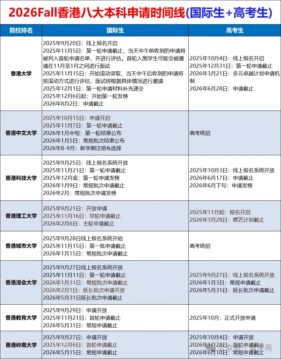 2026fall(也就是明年高考的同学)的申请时间线已经陆续出来了,一定要记好截止时间,港校普遍是 “先到先得”,早申请成功率更高,别等到最后一批才动手!