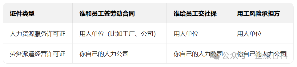 举个例子:你帮 A 公司招了 10 个工人,要是办的 “人力证”,工人跟 A 公司签合同,社保 A 公司交,工人离职找 A 公司;要是办的 “派遣证”,工人跟你签合同,社保你交,工人出问题第一个找你 —— 责任差远了,别弄错!