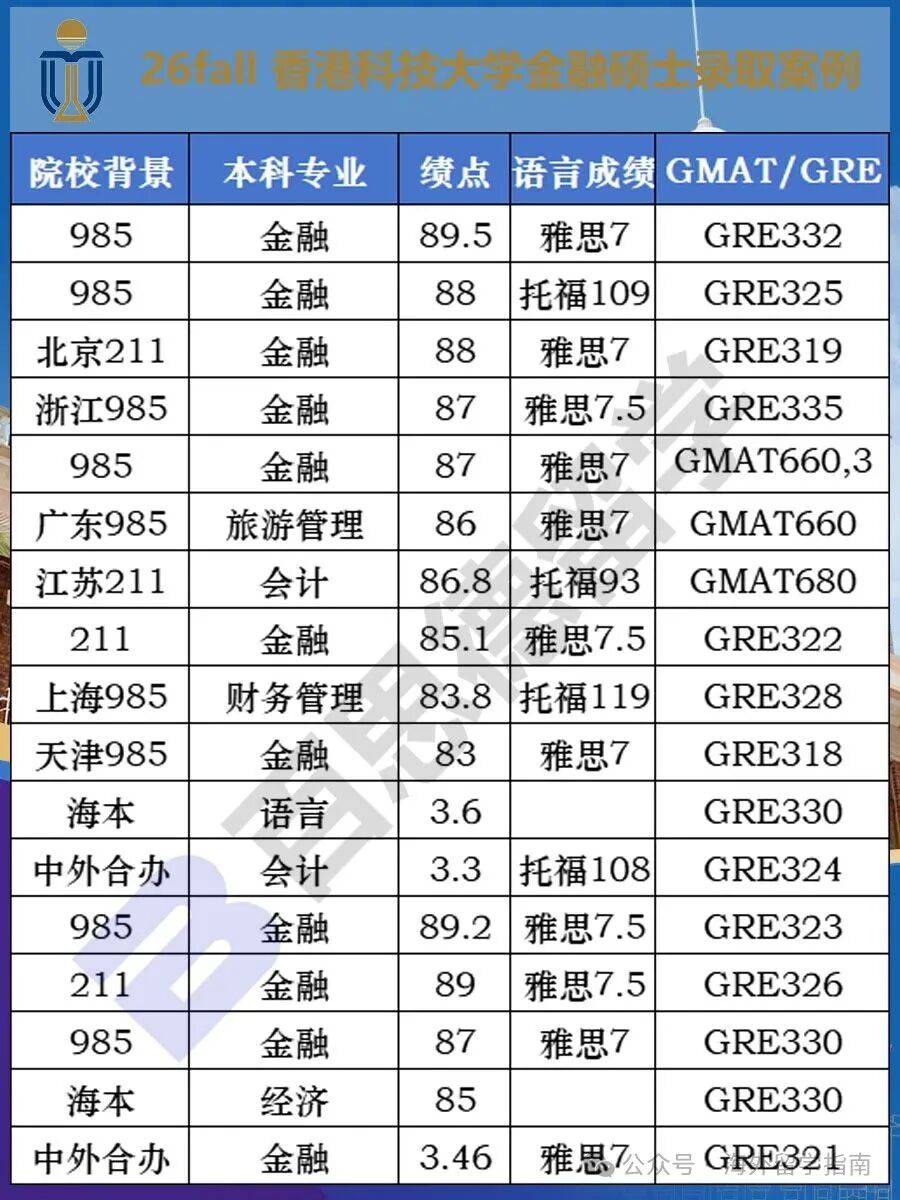 ✔️ 985高分段(87+):标化达标即可冲刺 浙江某985金融专业,GPA87,雅思7.5,GRE335,没有亮眼实习也顺利上岸——港科对985的“信任度”很高,只要核心成绩够,实习稍弱也能补。更惊喜的是天津某985金融83分,雅思7,GRE318也上岸了,后来了解到他有2段券商投行实习,可见实习能弥补GPA小短板。